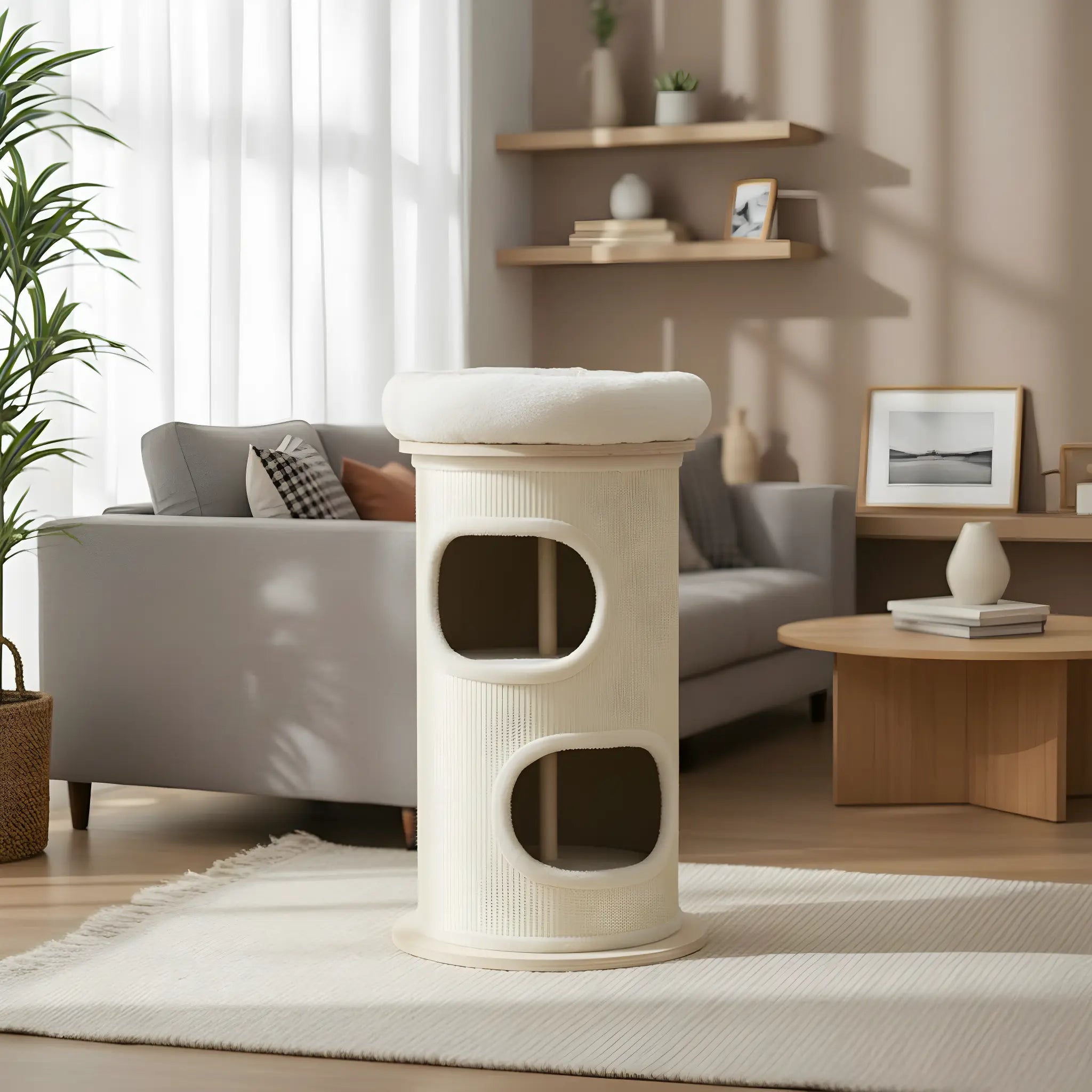 Zwei geräumige Höhlen mit weichen, herausnehmbaren und waschbaren Kissen machen den Bamboo L-Tower zu einem gemütlichen Rückzugsort. Jede Ebene ist leicht zugänglich, auch für ältere oder weniger agile Katzen.