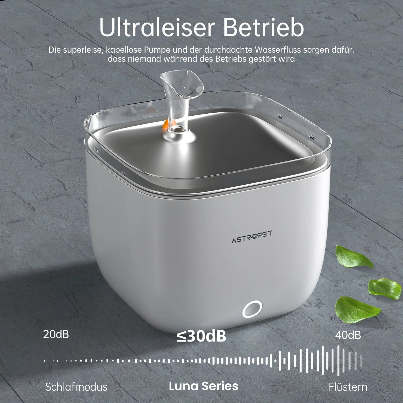The super quiet, wireless pump and the well thought -out water flow ensure that nobody is disturbed during operation. With only 32 dB operating noise, the drinking fountain is hardly audible and does not bother.