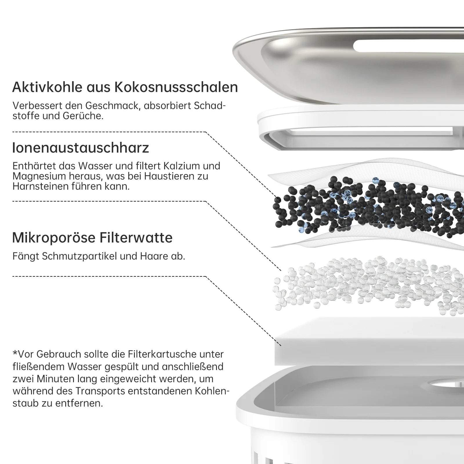Effective cleaning of the water by filtering heavy metals, hair and other foreign bodies. The triple filtering ensures comprehensive water cleaning by effectively removing heavy metals, hair and other contaminants.