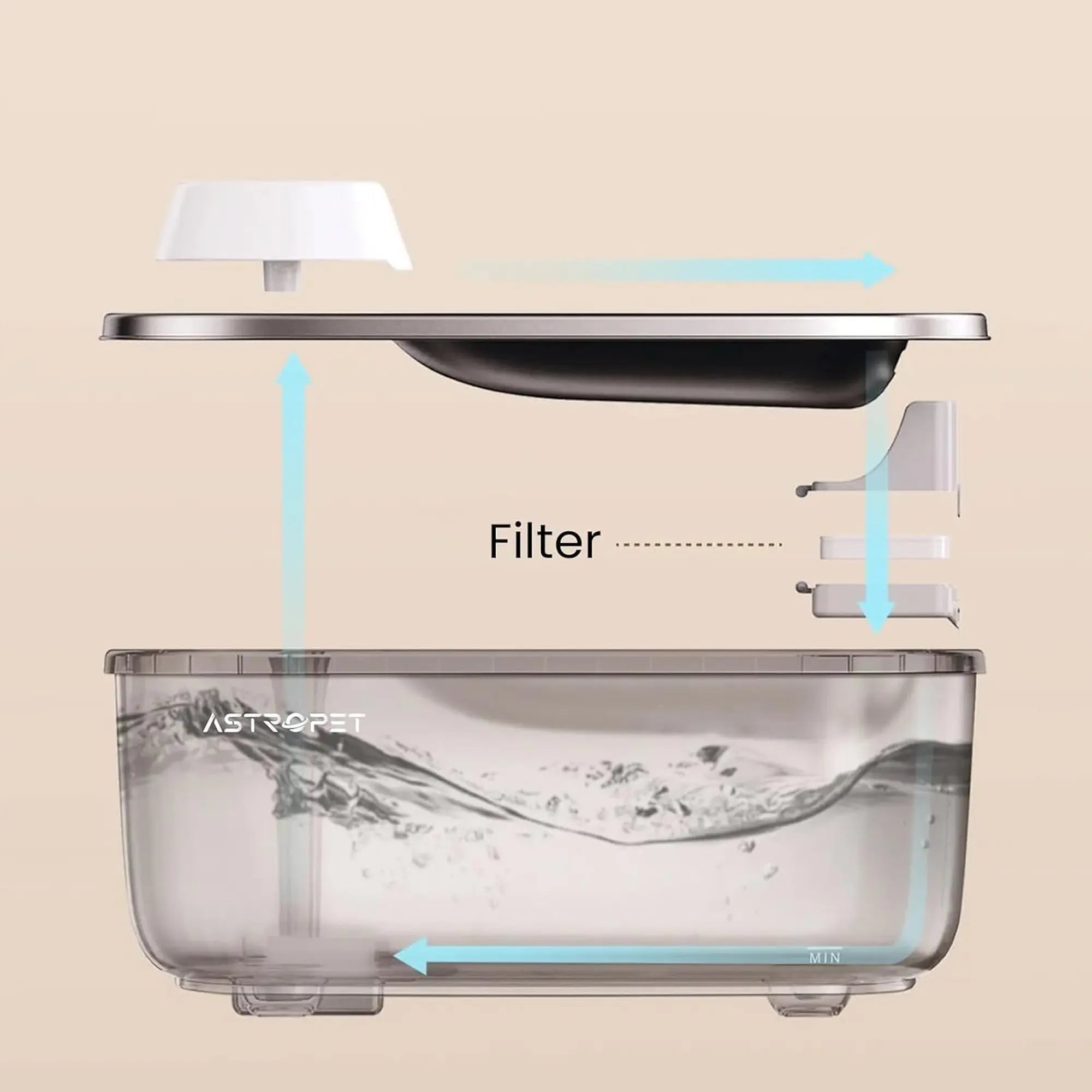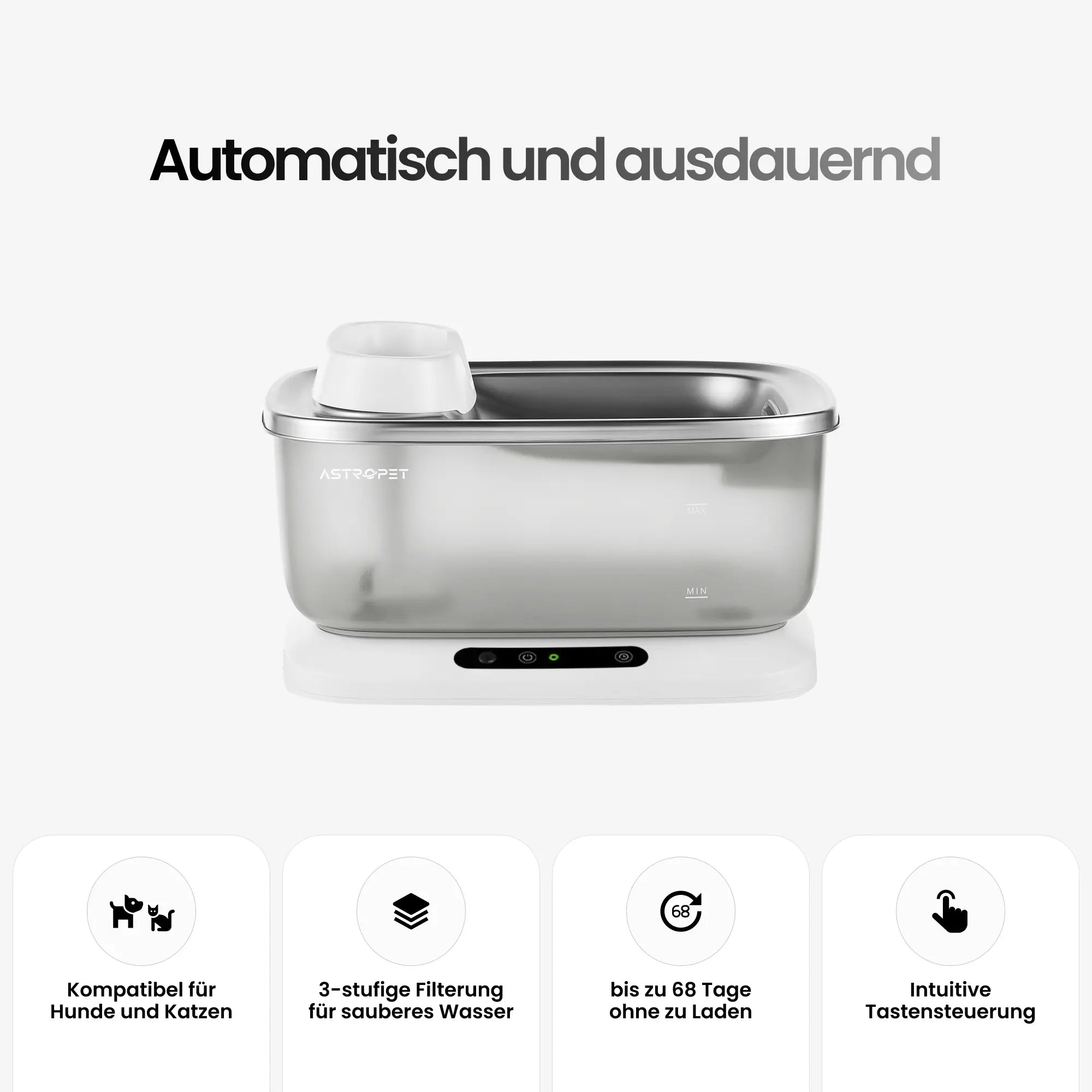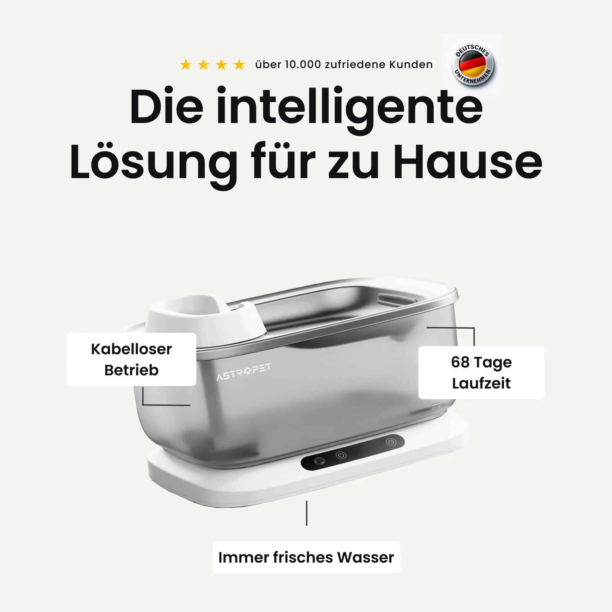 Die AstroPet Poseidon Pro ist ein kabelloser Trinkbrunnen mit 7 Litern Volumen, ideal für Katzen, Hunde und Mehrtierhaushalte. Mit Infrarotsensor für energieeffizienten Wasserfluss, bis zu 40 Tage Laufzeit ohne Nachladen.